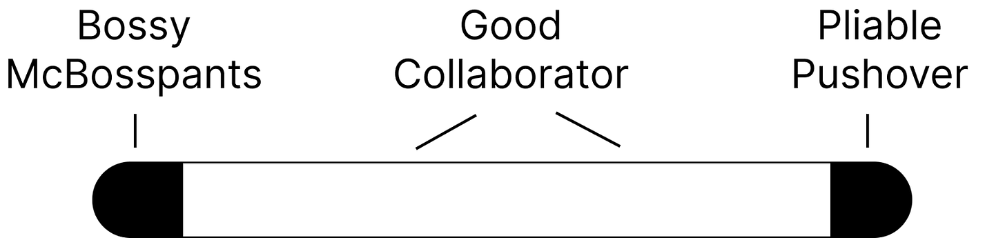 Good collaboration isn’t just saying your piece. It’s staying engaged as the idea evolves, even when it shifts away from your original take. Potential pushovers can stay in the room to avoid going off and resentfully doing the work of others, and McBosspants can stay in order to keep in collaboration rather than leave the work to everyone else.