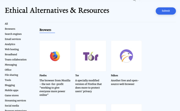 A curated list of Internet apps, tools, products, and websites that provide alternatives for a more sustainable, open, and ethical Internet life.